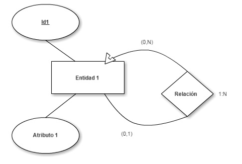 | (1,N) o (0,N) | (1,N) Entidad1 (IdEntidad1, AtributosEntidad1, IdRol(fk)) Igual que el caso anterior(0,N) Entidad1 (IdEntidad1, Atributos1) Rol (IdEntidad1, IdRol(fk)) |